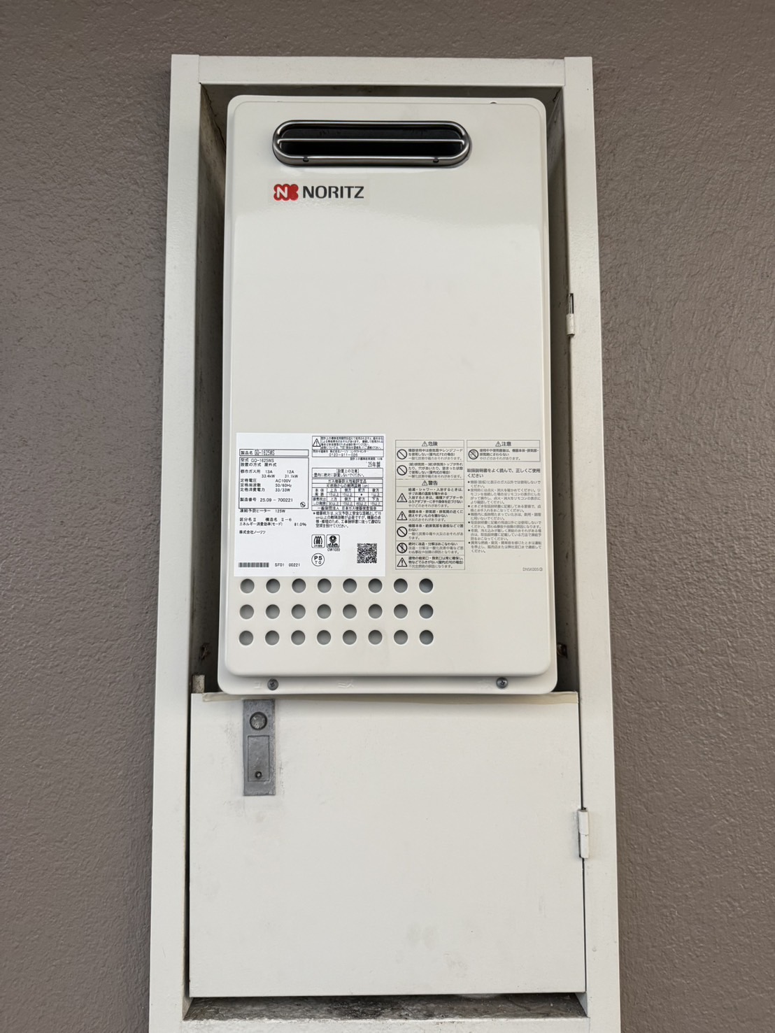 2025年11月6日:給湯専用機の交換 2025年11月7日 最終更新日時 : 2025年11月11日 employee_01 東京都江戸川区 R様 Before After 【商品詳細】・before GQ-162WS-KB(型番) ノーリツ製 ・after GQ-1625WS(型番) ノーリツ製 【備考】16号タイプBOXタイプからの交換になります。扉加工あり。